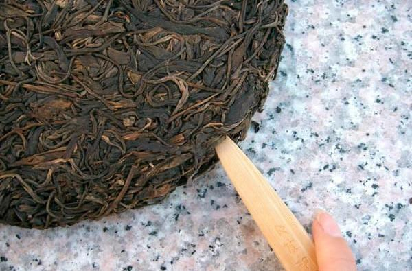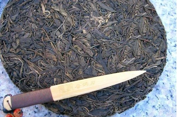 下面,我們以一餅普洱茶生餅為例:我們選用了一把竹質的茶刀