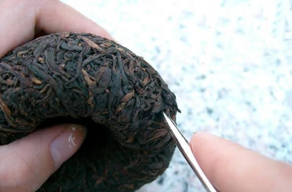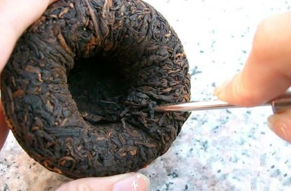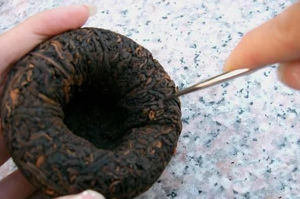 1.把茶錐沿沱茶的內渦邊沿用力插入。